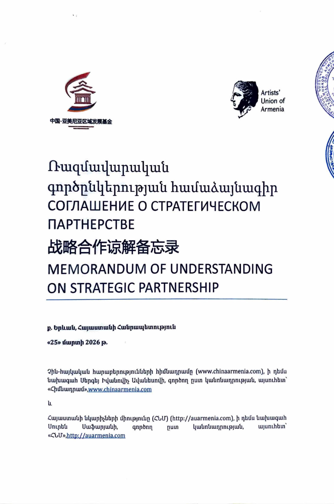 2026 թվականի մարտի 25-ին, Երևան քաղաքում, Հայաստանի նկարիչների միության շենքում տեղի ունեցավ հանդիպում և հանդիսավոր կերպով ստորագրվեց «Ռազմավարական գործընկերության համաձայնագիր (MoU) Չինա-հայկական հարաբերությունների տարածաշրջանային զարգացման հիմնադրամի (www.chinaarmenia.am) և Հայաստանի նկարիչների միության (http://auarmenia.com) միջև։