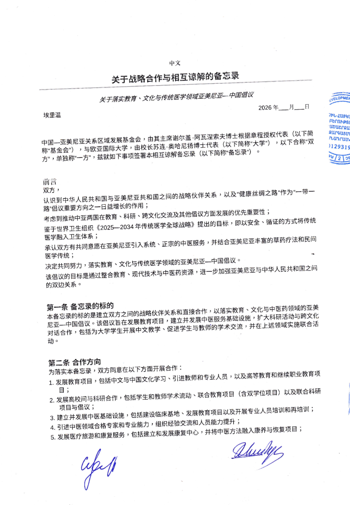 2026年4月8日,在埃里温,亚美尼亚—中国区域发展基金会与欧亚国际大学签署了关于相互理解与战略合作的备忘录。该文件旨在推动双方在教育、文化及中医药领域的合作发展。